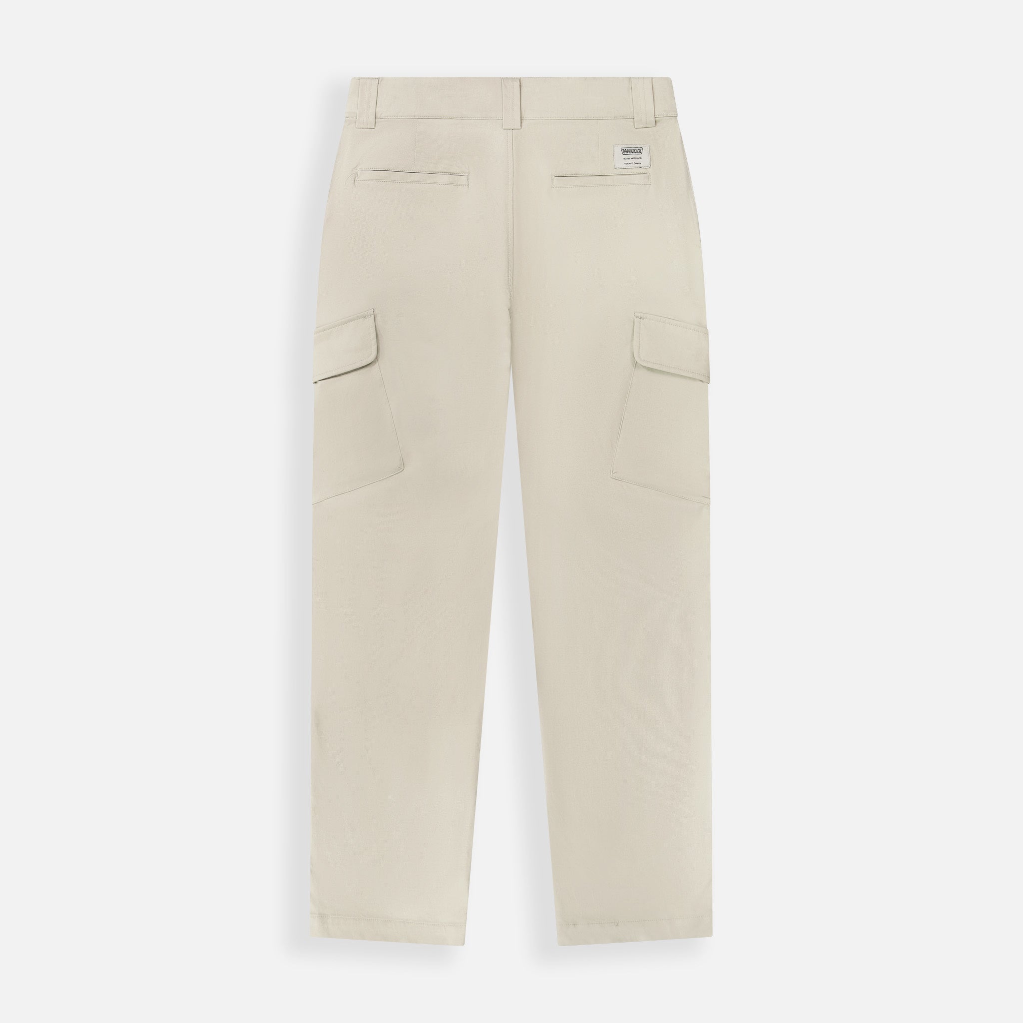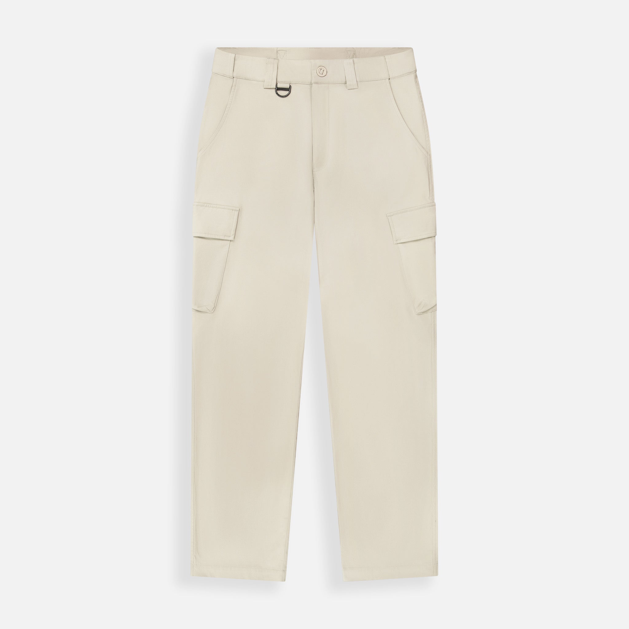 Designed with a regular rise and straight leg, the pants feature a hidden elastic waistband for flexible comfort. Functional details include a black enamel-coated D-ring at the front, front slash pockets for easy access, and expandable side cargo pockets with flap-and-bellow construction. Back welt pockets and a stitched heritage label complete the look with refined utility.